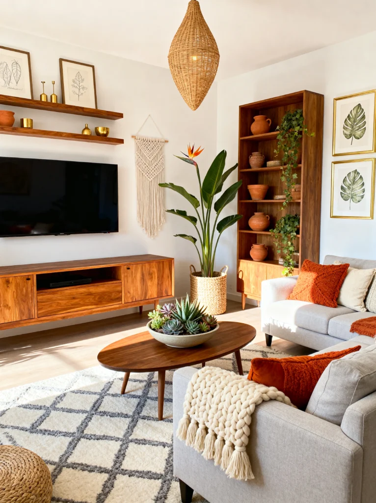 This room is a breath of fresh air. If your goal is to create a “sanctuary” vibe, this organic, light-filled aesthetic is the way to go. The neutral gray sectional is the perfect blank canvas, allowing the warmer wood tones and pops of burnt orange to really shine. I love how the chunky knit throw and the macramé wall hanging add all that essential “boho” texture.