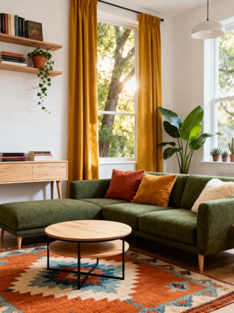 What really ties this space together is the geometric rug. It has those rusty oranges and soft blues that bridge the gap between the green furniture and the wooden elements. It’s a great reminder that you don’t need a million decorations to make a room feel complete. A few well-placed plants, some stacks of books on a light wood console, and a simple round coffee table are all you need when your color palette is this strong.
