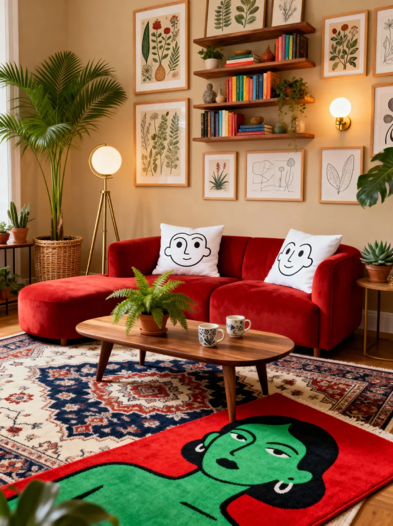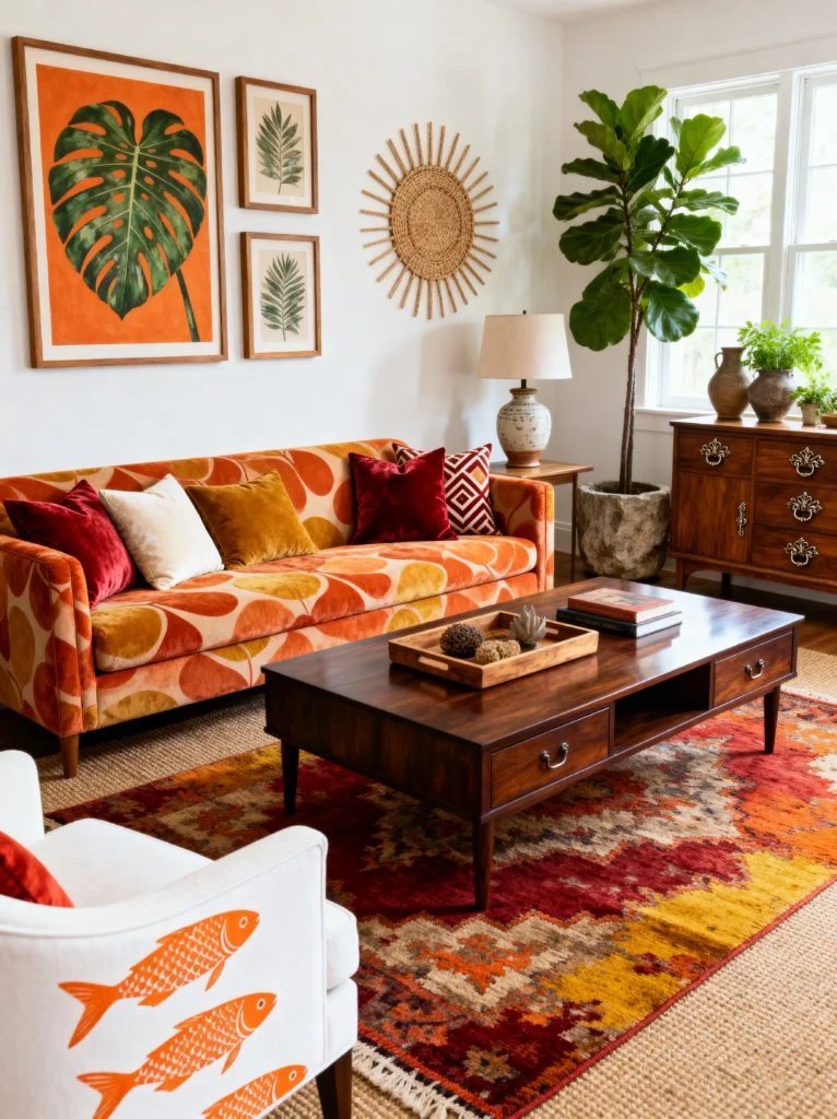 I really love the gallery wall here. The oversized monstera leaf art next to the sunburst mirror creates a focal point that’s impossible to ignore. And look at the details—the white armchair with the orange fish print adds a quirky, playful touch that shows the person living here doesn’t take things too seriously. When you’re going for a maximalist look, the trick is to keep a consistent color story (like the oranges, reds, and wood tones here) so the room feels “full” rather than “cluttered.”