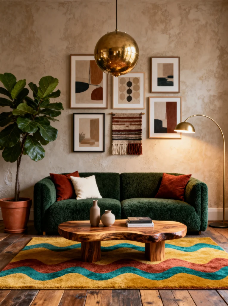 The rug is probably my favorite part of this setup. Those wavy lines of teal, orange, and yellow add a sense of movement and playfulness that balances out the more “serious” dark green sofa. The gold globe pendant light hanging low over the table adds a touch of glam and creates a cozy “zone” for conversation. It’s a masterclass in using different materials—velvet, wood, metal, and wool—to create a room that feels incredibly rich and layered.