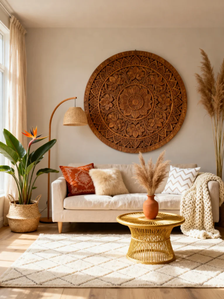 If you want your living room to feel like a high-end retreat, look no further. This space is all about monochromatic texture. By sticking to creams, beiges, and light woods, the focus shifts entirely to the shapes and patterns. That massive carved wooden wall art is a stunning centerpiece—it adds so much architectural interest without needing any color at all.