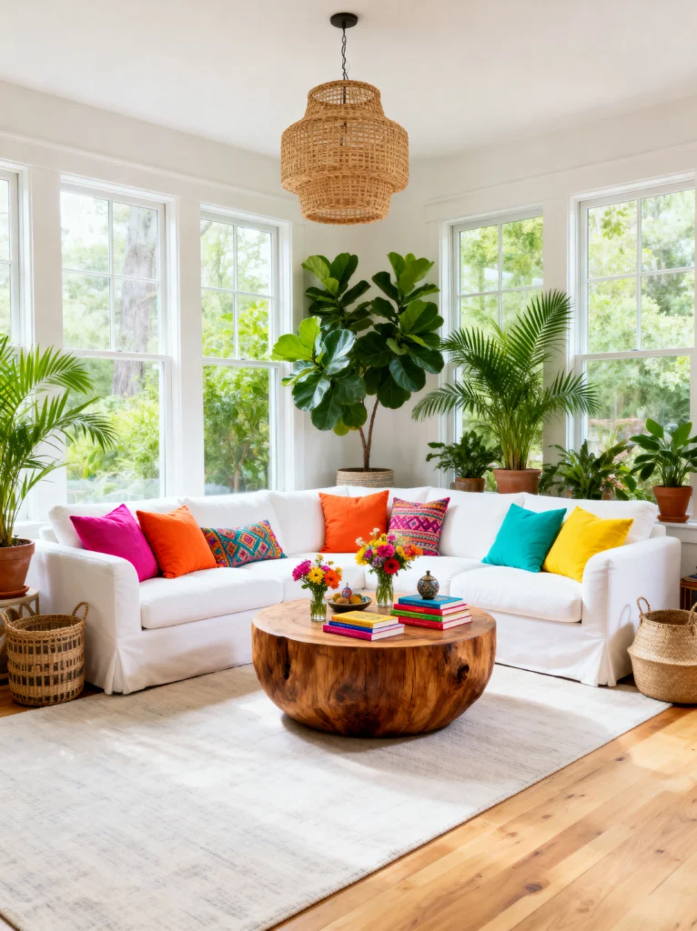 Check out that coffee table—it’s a massive, raw-edge wood stump. It grounds the whole room and brings in an organic texture that balances out the clean lines of the windows. To keep the white sofa from looking too “stiff,” it’s piled with mismatched, vibrant pillows in pink, teal, and orange. It’s a great reminder that you don’t need a colored sofa to have a colorful room. Just add plants, a woven light fixture, and a few bright books, and you’ve got a space that breathes.