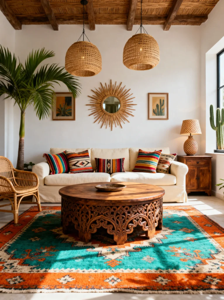 The colors here are pulled straight from a desert landscape—the turquoise and orange in the rug, the terracotta pots, and the cactus art. The sunburst mirror over the sofa acts like a literal sun in the middle of the room. It’s a very bright, happy space that celebrates natural materials and global-inspired patterns. It makes you want to kick off your shoes and just relax.