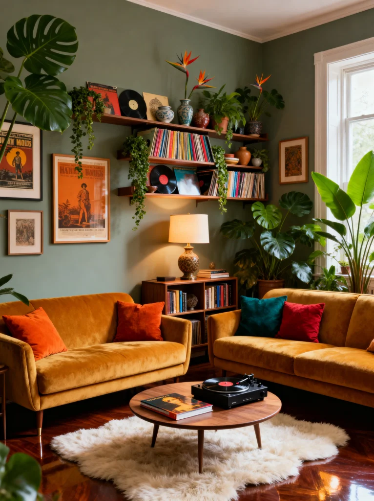 The real star here is the shelving unit. Having your vinyl collection on display isn’t just about storage; it’s a decorative statement. I love how the record sleeves provide their own pops of color. And notice the lighting? That warm, amber glow from the table lamp makes the velvet look even richer. Throw in a shaggy white rug for some “70s cool” texture, and you’ve got a room that feels sophisticated but totally ready for a late-night listening session.
