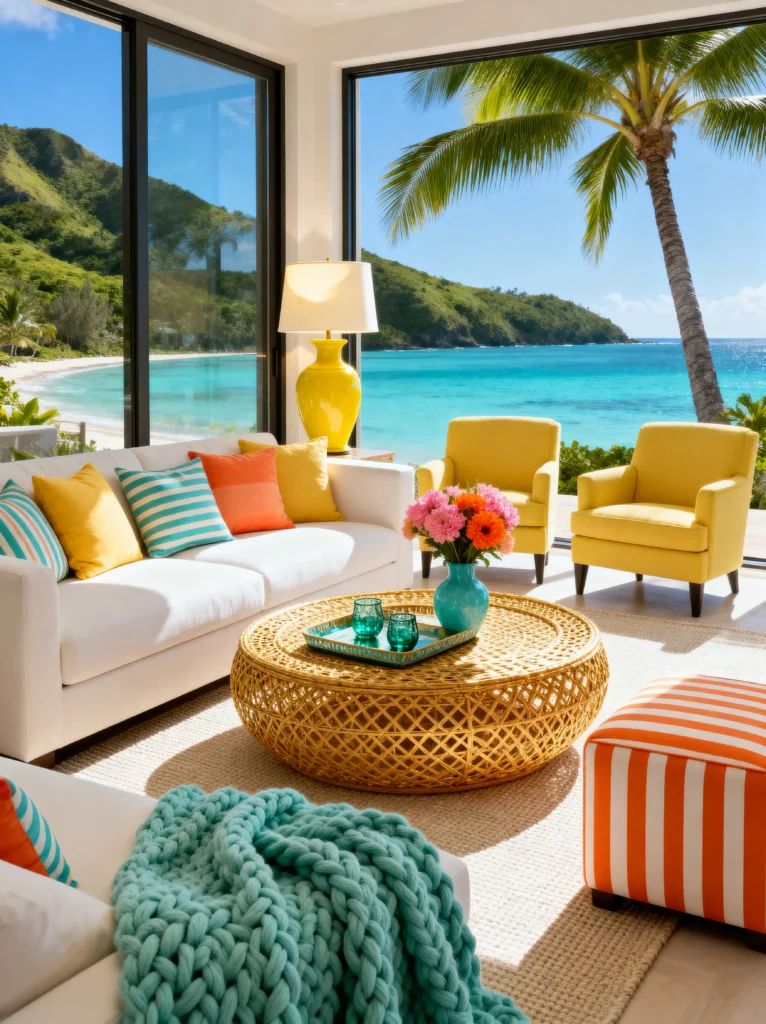 We’re heading back to the tropics, but with a punchier, more modern twist. This isn’t your grandma’s beach house. The white sofa acts as a canvas for a “sunset” palette of yellow, orange, and teal.