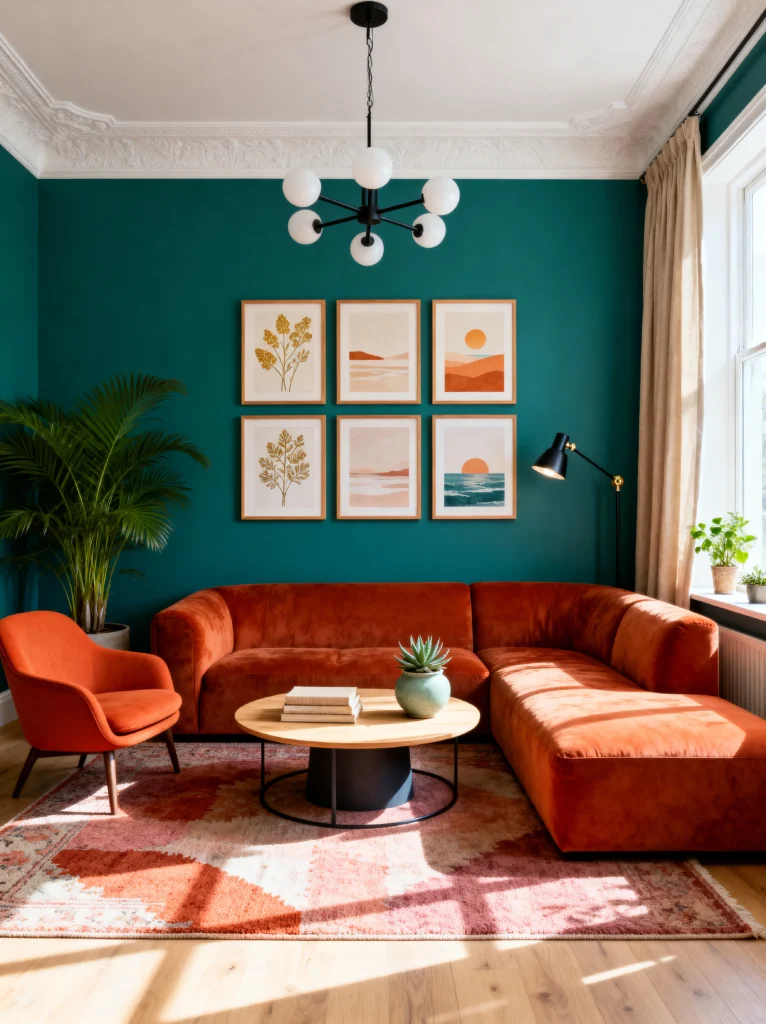 Deep teal walls are a bold move, but man, do they pay off. Look at how that burnt orange sectional just glows against the dark background. It’s a classic complementary color scheme (blue and orange), and it never fails.