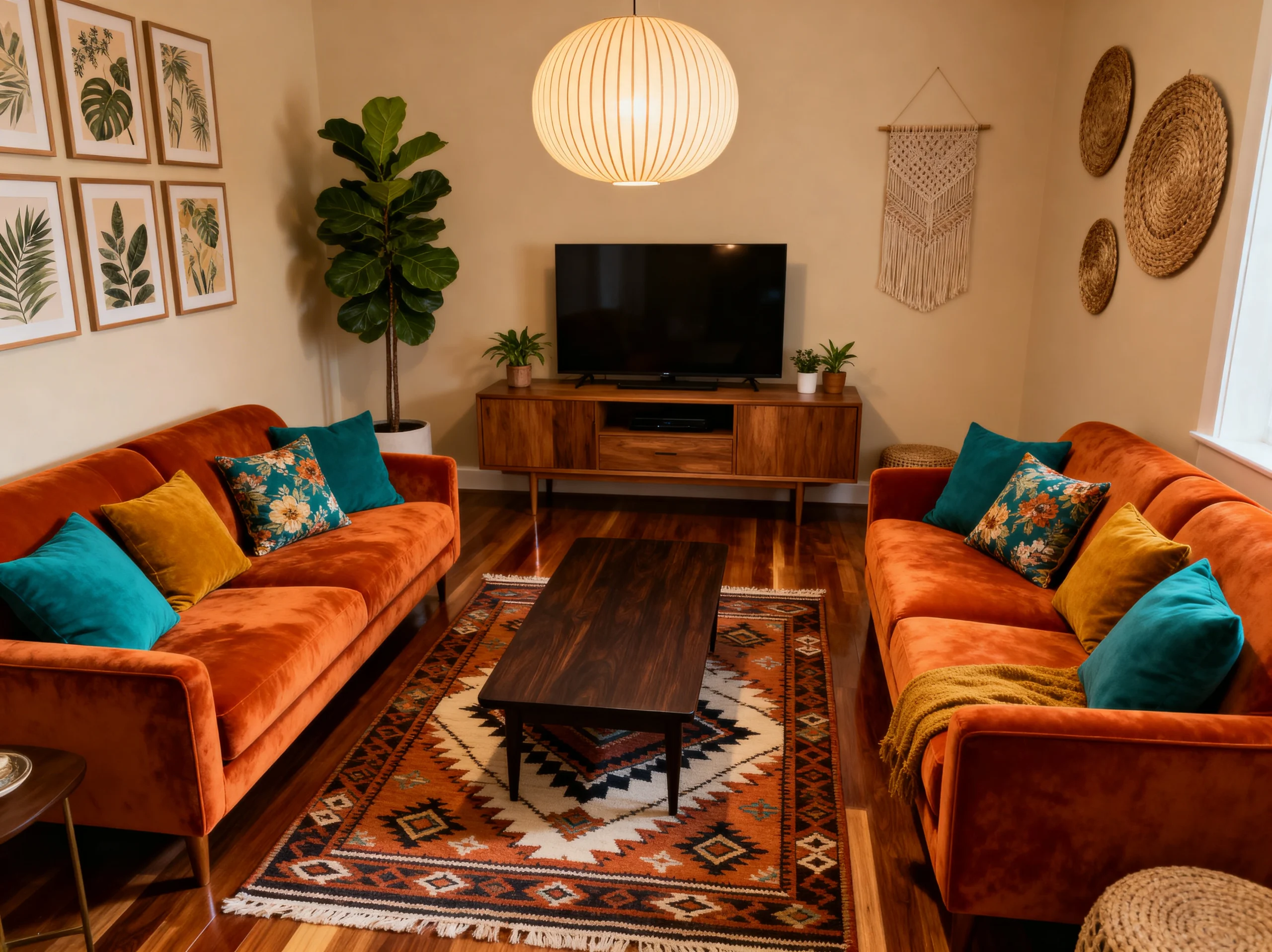 The colors here are pulled straight from a desert landscape—the turquoise and orange in the rug, the terracotta pots, and the cactus art. The sunburst mirror over the sofa acts like a literal sun in the middle of the room. It’s a very bright, happy space that celebrates natural materials and global-inspired patterns. It makes you want to kick off your shoes and just relax.