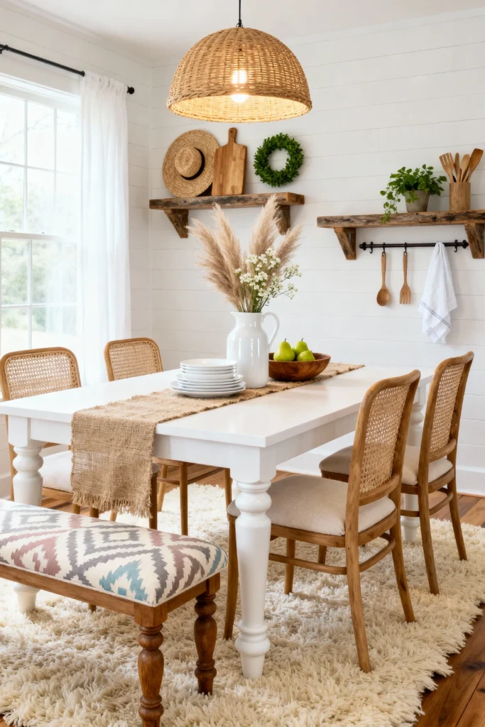 Can we talk about how bright and airy this feels? This is the kind of space where I’d want to sit with a cup of tea and just watch the sun come through those sheer white curtains. The white shiplap walls are a total classic, but it’s the textures that really make it work. Look at that jute table runner and the chunky woven rug—it adds so much warmth without needing a ton of color.