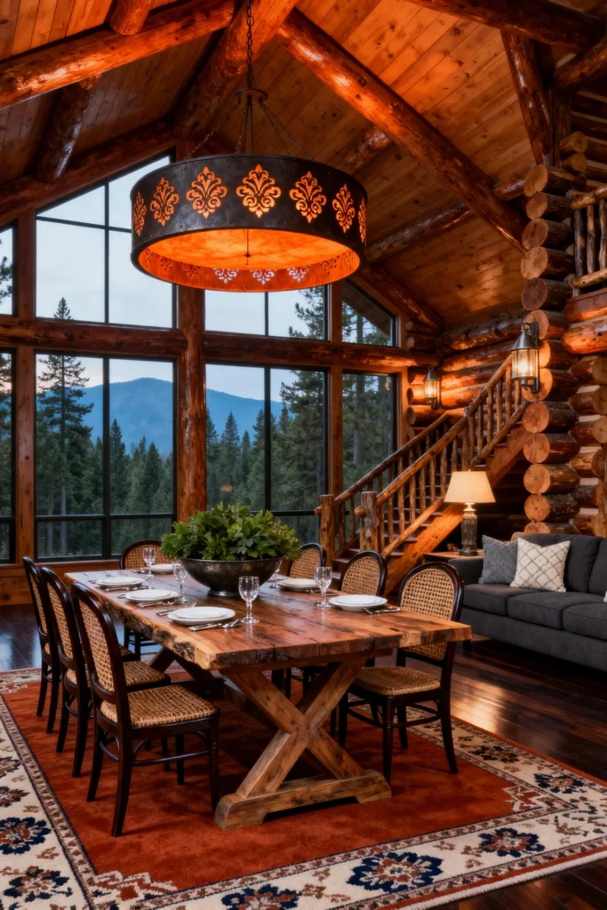 That giant metal chandelier with the glowing orange center is such a cool focal point. It feels very industrial but warm. The long wooden table with the X-frame legs is perfect for a big family dinner. Even though it’s a huge, grand space, the rug and the comfy sofa in the background keep it feeling like a home. It’s the perfect blend of rugged and refined.