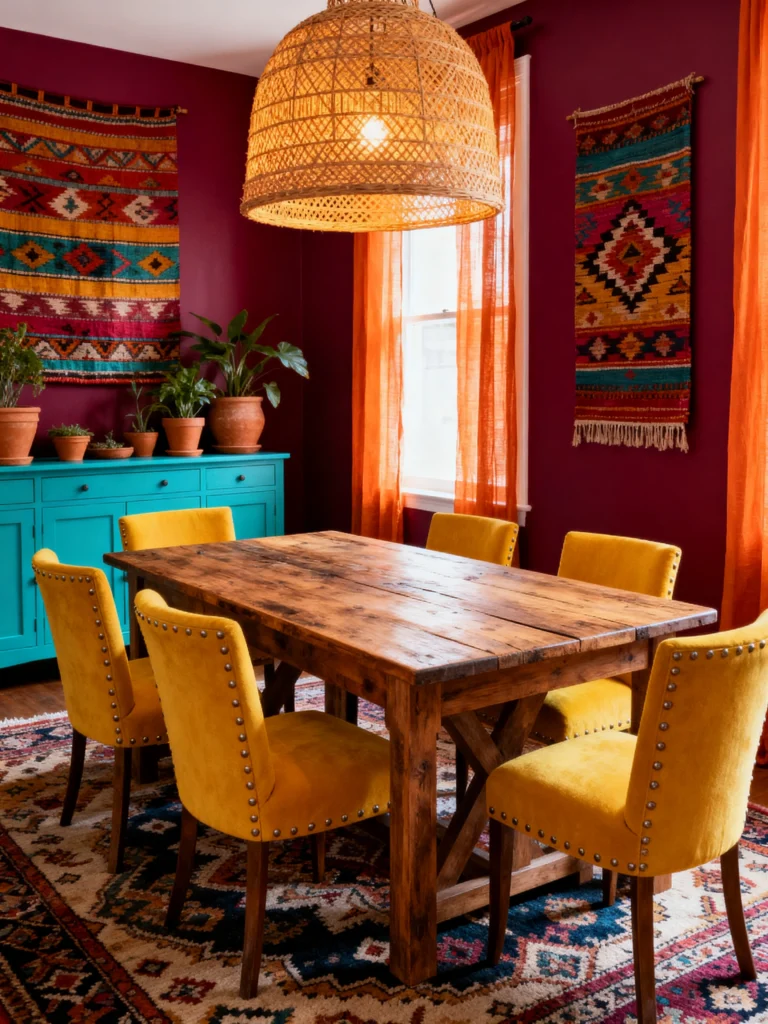 If you aren’t afraid of color, this room is your spirit animal. The first thing that hits you is that deep, moody burgundy on the walls. It’s a risky move that paid off perfectly because it makes everything else pop. The turquoise sideboard is such a genius contrast—it shouldn’t work with the yellow velvet chairs, but it absolutely does.