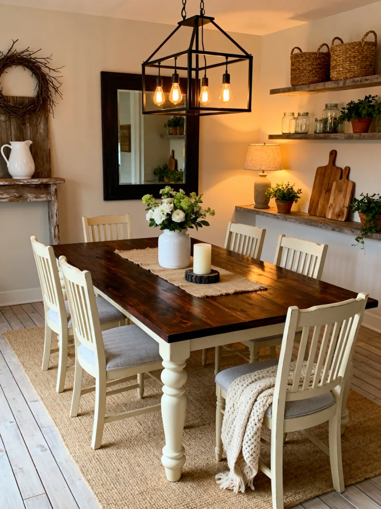 This is the kind of room that makes you want to bake a fresh loaf of bread. It’s all about that “lived-in” comfort. The heavy, dark wood table is a gorgeous anchor for the lighter, cream-colored chairs. It feels sturdy and dependable, like it’s ready for a messy family dinner or a long night of board games.