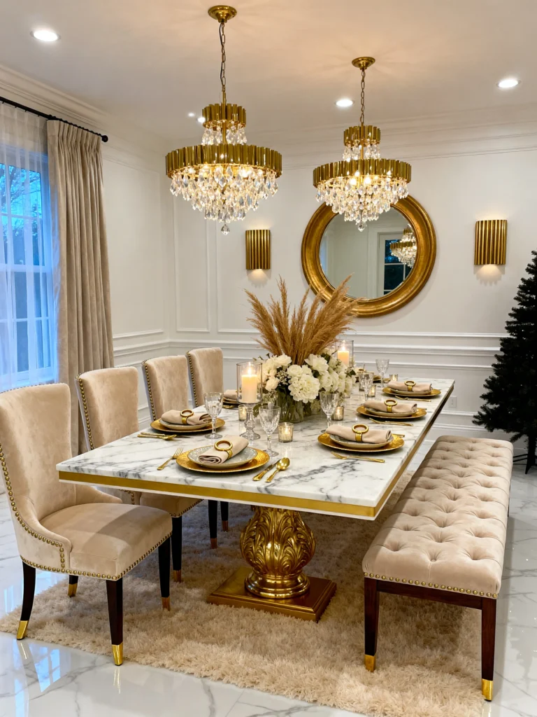 Okay, if you want to feel like royalty every time you sit down for breakfast, this is the one. This room is pure luxury. We’re talking a massive white marble table with a gold pedestal base that is basically a work of art. The tufted velvet chairs and the matching bench look so plush you could probably nap in them.