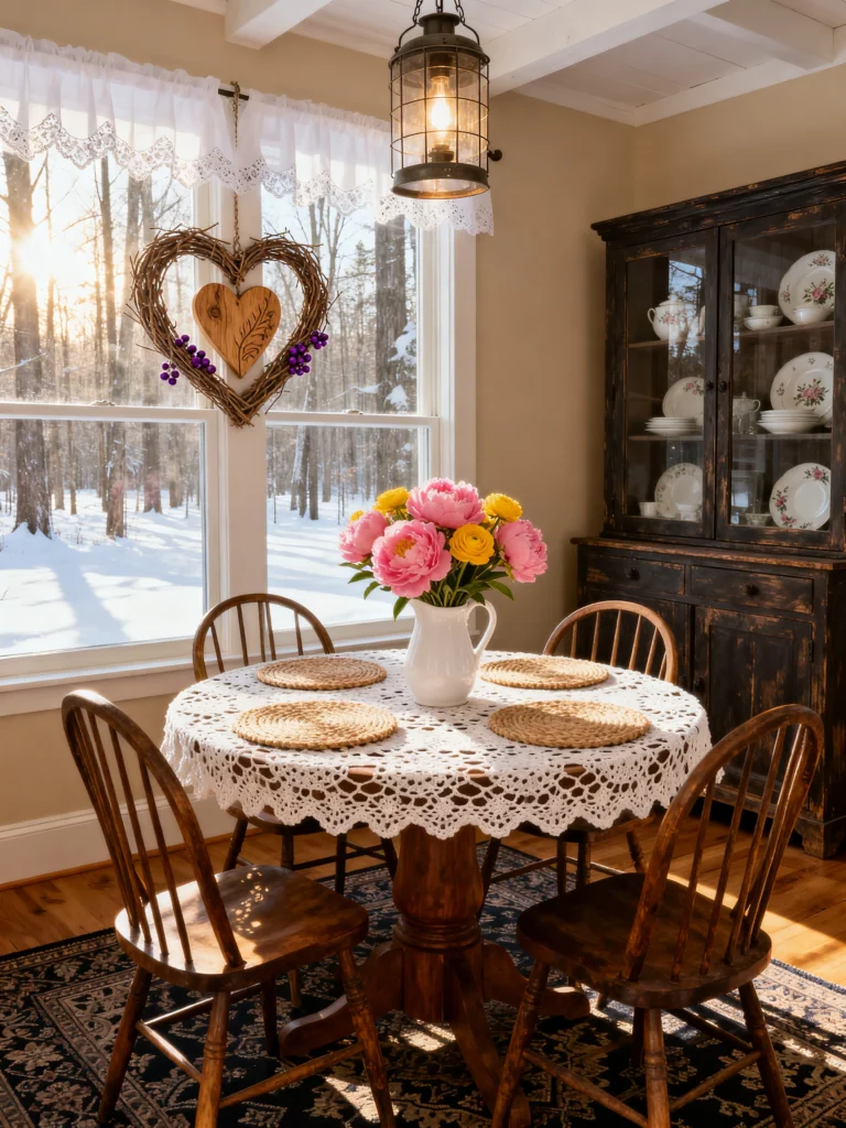 The view out that window is incredible—the snowy woods create such a peaceful backdrop. Inside, the dark, distressed hutch filled with floral china adds so much character. The pop of pink peonies on the table is the perfect finishing touch. It’s a simple, sweet space that proves you don’t need a giant room to make a big impact.