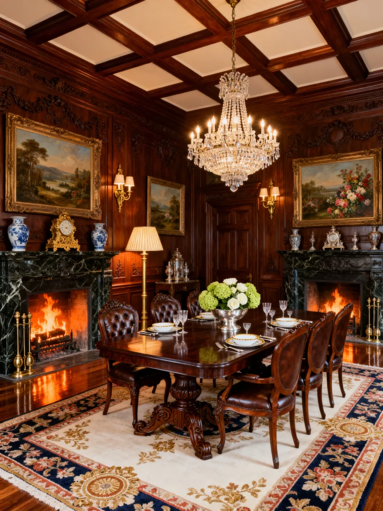 This is “old money” style at its finest. It looks like a library in a historic mansion. The dark wood paneling on the walls and the coffered ceiling are absolutely stunning. You’ve got twin fireplaces with green marble surrounds—I mean, who has two fireplaces in one room? It’s amazing.