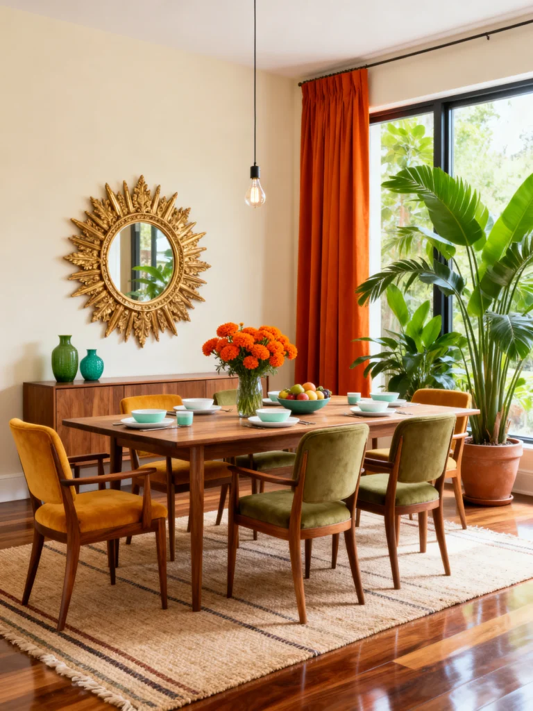 This one is for my mid-century modern fans. It’s got such a cool, 1970s-meets-today vibe. Those velvet chairs in mustard yellow and moss green are such a vibe, and the wood table has those clean, tapered lines that define the era.