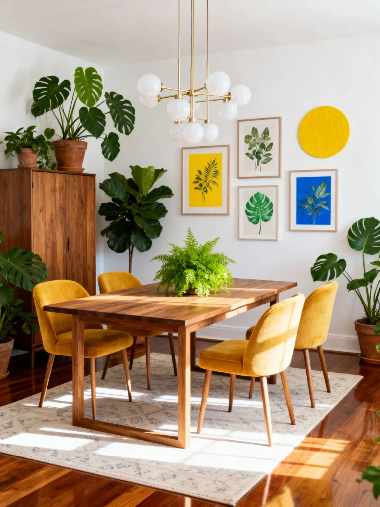 If you’re a “plant parent,” this is your dream come true. The white walls and light wood table act as a blank canvas for all that beautiful greenery. It feels so fresh and airy. The gallery wall with the botanical prints and that bright yellow circle adds a really cool, modern artistic touch.