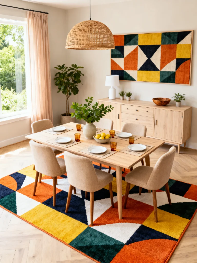 This room is all about playful patterns. That rug is everything! The bold triangles in orange, navy, and yellow bring so much energy to the floor. Then you look up and see the matching textile art on the wall—it’s such a clever way to tie the whole room together without it feeling “too much.”