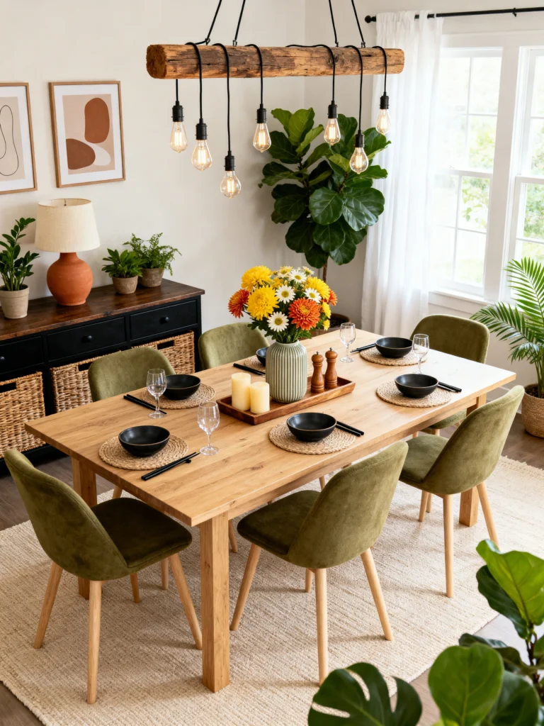 Last but not least, we have this beautiful blend of natural elements and modern design. The standout feature is definitely that “beam” chandelier with the Edison bulbs—it’s such a cool, raw look. The olive green chairs are soft and earthy, and they look great against the light wood table.