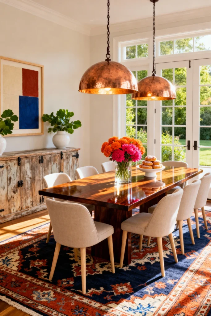 This one is for my lovers of rich colors and sleek lines. That polished wood table is absolutely stunning—the way the light reflects off it makes the whole room feel expensive. But what really grabs your eye are those oversized hammered copper pendant lights. They bring in such a warm, metallic glow that ties the whole room together.