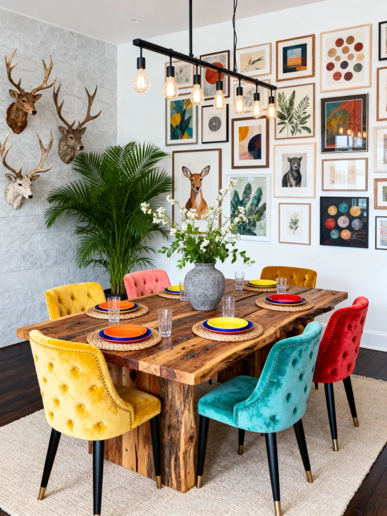 But the real stars are those velvet tufted chairs. Having them in different colors—mustard yellow, teal, and deep red—is such a bold move. It makes the space feel incredibly energetic. The live-edge wood table grounds all that color with something natural and rugged. And did you notice the three deer heads on the stone wall? It’s a little bit of “lodge” mixed with a whole lot of “art gallery.”