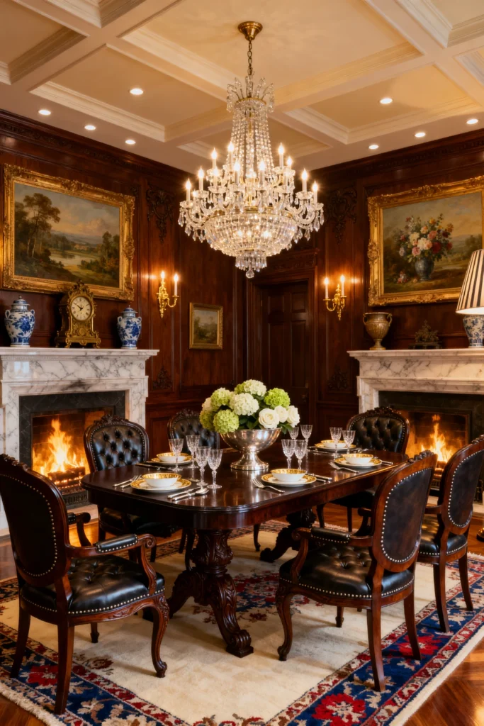 That crystal chandelier is a total showstopper. It’s massive and glamorous, casting light everywhere. The table is set so perfectly with gold-rimmed plates and fine crystal—it’s very formal, but the plush leather chairs look comfortable enough to actually sit in all night. It’s definitely a more “serious” look, but it’s done with so much style.