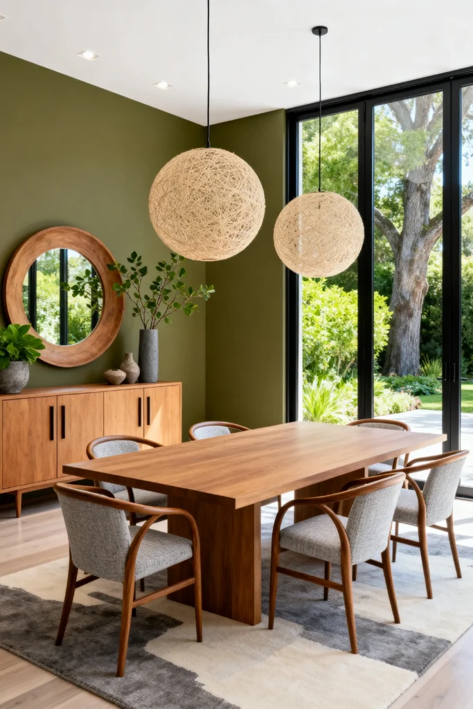 This space is so calming. If you love the “Japandi” or modern organic look, you’re going to love this. That olive green accent wall is everything—it’s a bold color, but because it’s an earth tone, it feels very grounded. The two giant “yarn ball” pendant lights are such a cool architectural feature. They add so much soft texture to the room.