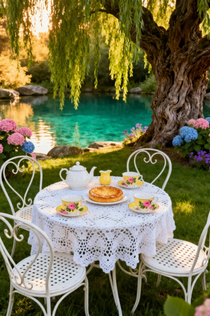 Can you even imagine having breakfast here? This is straight out of a fairy tale. Setting a table right under a weeping willow tree next to a crystal-clear pond is just pure magic. The white wrought-iron chairs and the lace tablecloth give it such a delicate, vintage feel. It’s very “cottagecore” in the best way possible.