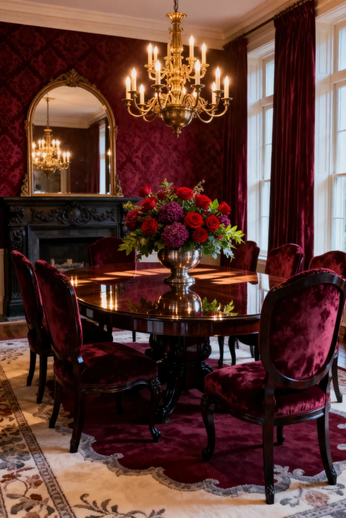 If you want drama, look no further. This room is all about that deep, moody red. The damask wallpaper is so intricate, and matching it with those heavy velvet curtains makes the whole space feel like a private club. It’s very romantic and a little bit mysterious.