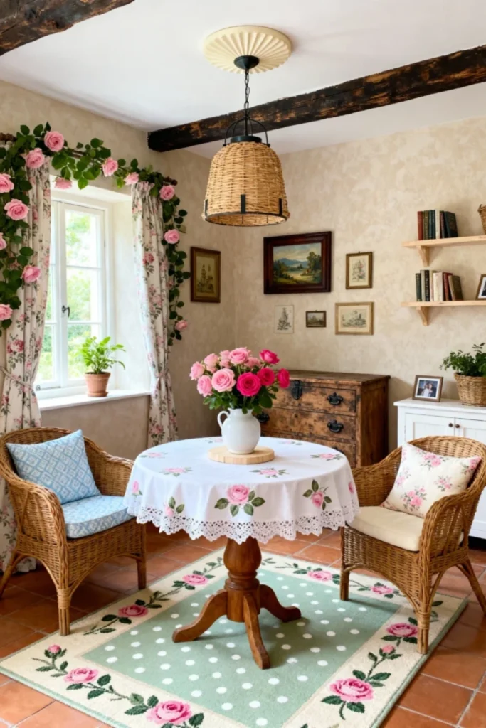 The wicker chairs look so comfortable, especially with those mismatched floral and polka-dot pillows. And look at the rug—it’s got a polka-dot center with a rose border! It’s very “shabby chic” but feels fresh. It’s the kind of room that feels lived-in and loved, full of little treasures on the shelves and photos on the sideboard.