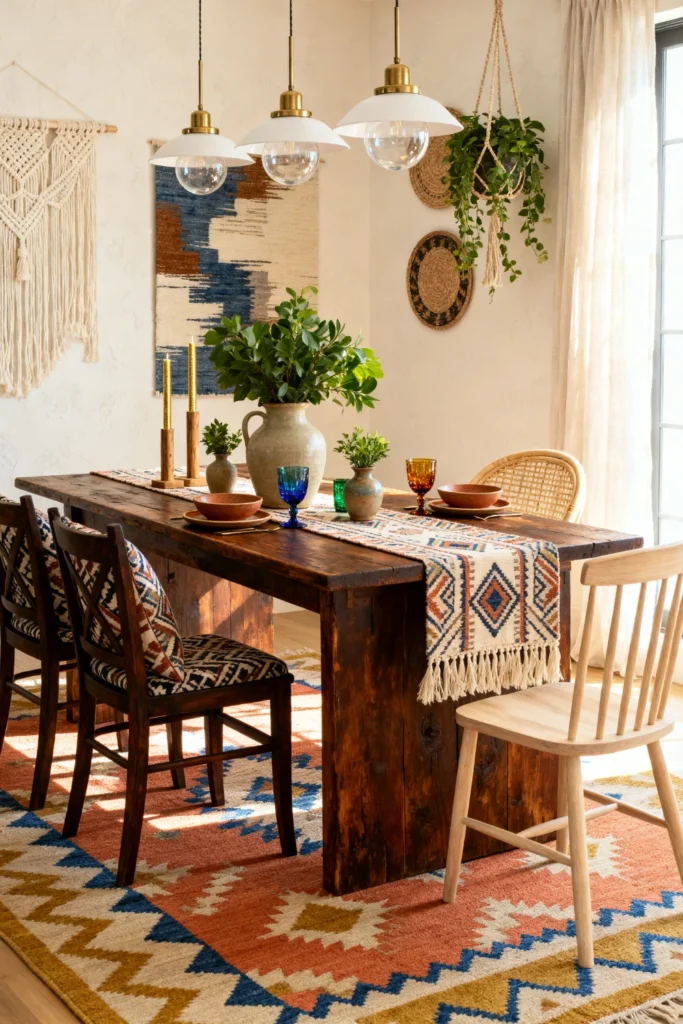 The textiles are what really make this room. You’ve got the macramé hanging on the wall, the woven baskets, and that awesome geometric rug. Even the chairs are a mix—some dark wood with patterned seats and others in a light natural wood. It feels very creative and relaxed, like a place where everyone is welcome to just hang out.