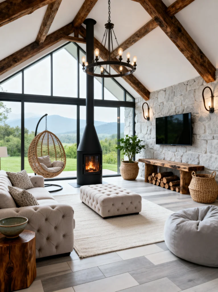 The fireplace is the real MVP here. That black, minimalist chimney cutting through the center of the room is such a bold, modern move against the traditional white stone wall. And look at the ceiling! Those thick, dark wood beams add so much character. I love how they paired the structured, tufted sofa with a whimsical hanging wicker chair. It says, “I’m sophisticated, but I also like to swing around and relax.” It’s the ultimate spot for a rainy Sunday.