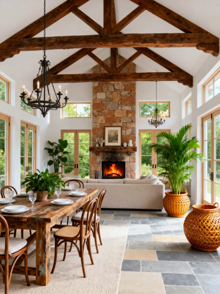 If the last room was about “airy light,” this one is all about “earthy texture.” This dining and lounging area feels so grounded. The star of the show is undeniably that floor-to-ceiling stone fireplace. It’s rugged, slightly asymmetrical, and looks like it was built from stones gathered right off the property. It gives the room a sense of history and permanence that’s hard to fake.