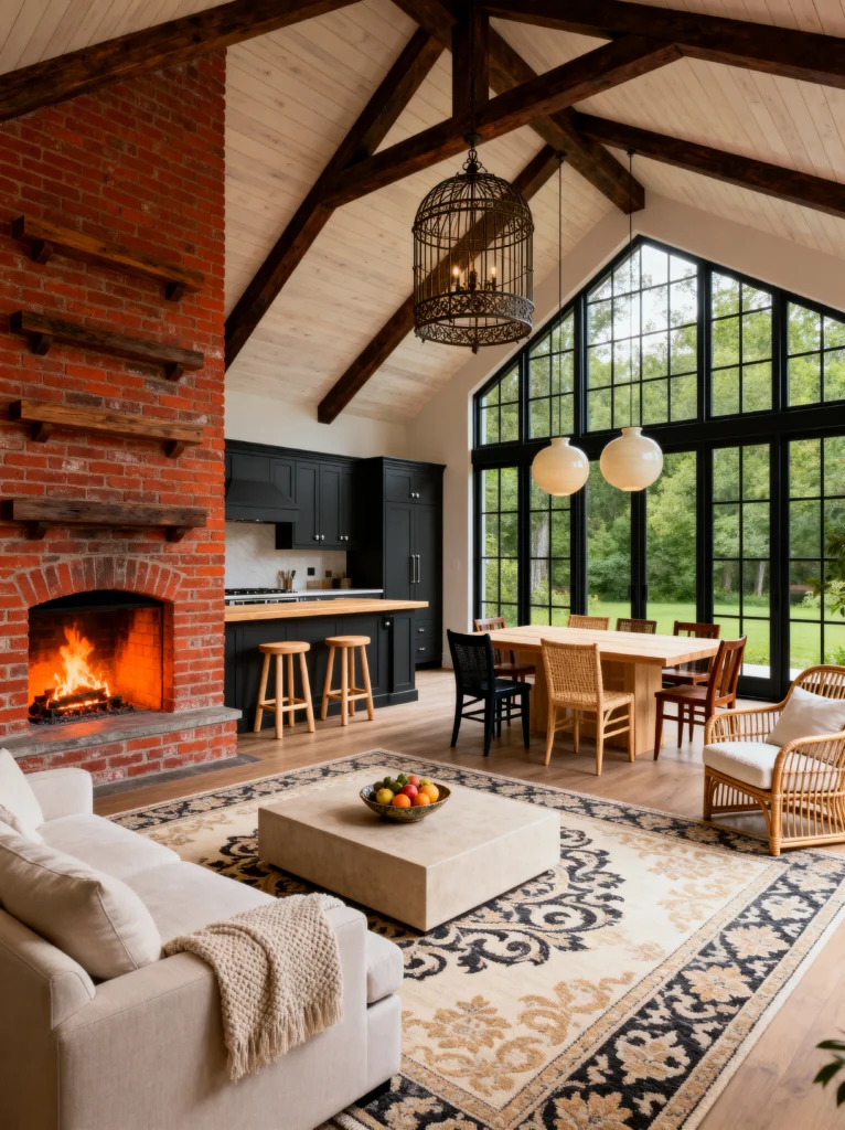 The kitchen in the background is the perfect “modern” counterpoint to the “rustic” brick. The black cabinetry is sleek, sophisticated, and a little bit moody. It creates a beautiful backdrop for the light wood countertops. And then you have that massive, floor-to-ceiling window wall. The shape of the window mimics the pitch of the roof, which is an architectural detail that just screams “custom home.”