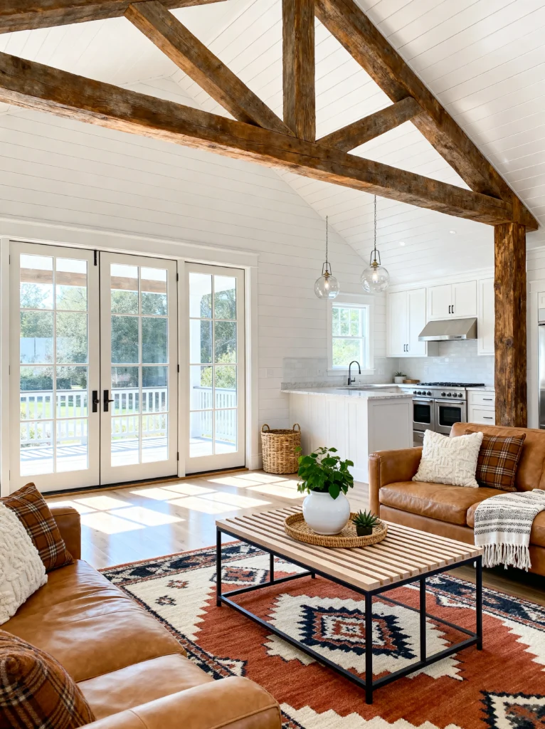 This is the quintessential Modern Farmhouse dream. If you like the “Magnolia” look, this is your gold standard. White shiplap walls? Check. Natural wood beams? Check. Cognac leather sofas? Double check. It’s a look that is bright, clean, and incredibly welcoming.