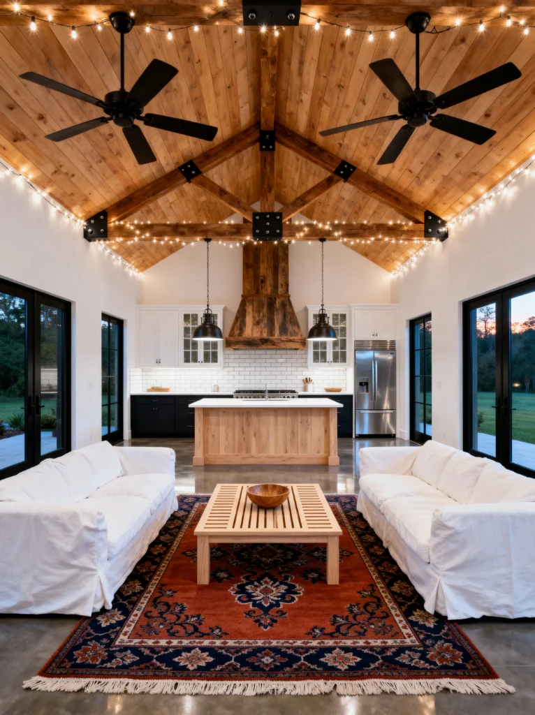 Let’s start with a space that feels like a permanent vacation. If I walked into this room, the first thing I’d do is drop my bags and just exhale. What strikes me first about this living area is the incredible height of the vaulted ceilings. Instead of leaving all that white space empty, they’ve draped delicate string lights across the dark wood trusses. It gives off such a whimsical, “garden party” vibe, but inside your own house!