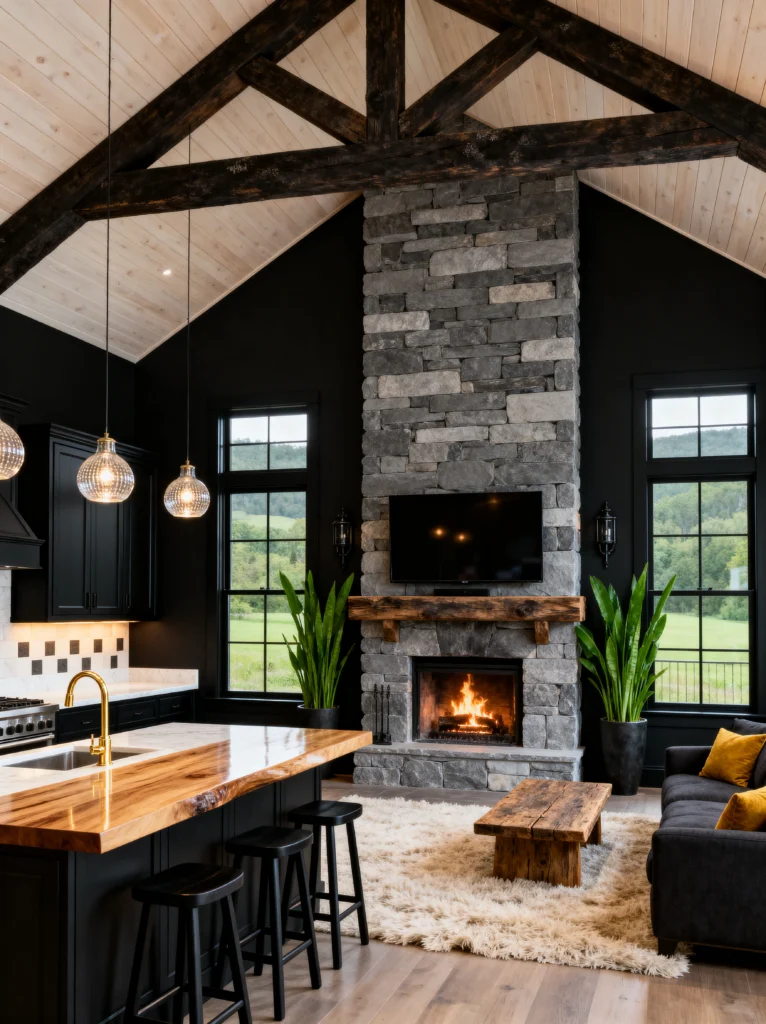 Okay, for my friends who aren’t afraid of the dark side—this one is for you. This room is a masterclass in using black without making it feel like a cave. By painting the walls matte black, the designers made the light wood ceiling and the grey stone fireplace absolutely pop. It’s moody, it’s dramatic, and honestly, it’s a total vibe.