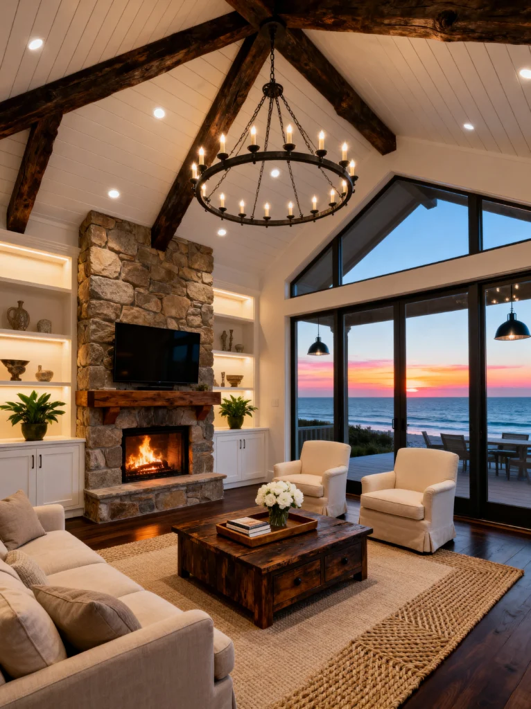I’m obsessed with that circular chandelier. It has a bit of a medieval-meets-modern look that grounds the airy room. The choice of neutral, creamy furniture lets the colors of the ocean and the sunset do all the talking. And that rug! The heavy texture looks so soft underfoot. This is exactly where you want to be after a long day at the beach—warm fire going, toes in the rug, watching the waves.