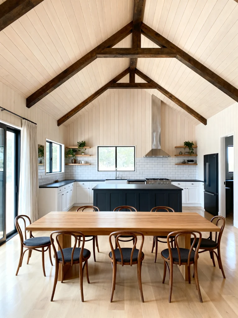 The furniture choices are so intentional. That long, rustic dining table looks like it has seen a thousand family dinners, and the bentwood chairs add a touch of classic bistro charm. Notice how the light fixtures—the wrought iron chandeliers—mimic the black hardware on the doors. It’s those tiny repeating details that make a room feel “designed” rather than just “thrown together.” It’s a masterclass in using natural materials to create warmth.