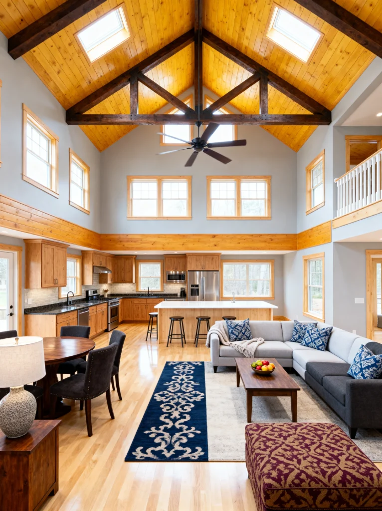 The pop of blue in the rug and the pillows is such a refreshing change of pace from the neutrals we’ve seen. It gives the room a bit of a “Lakeside” personality. I also love the second-floor loft overlooking the living area; it makes the whole house feel connected. Whether you’re cooking in that spacious kitchen or lounging on the sectional, you’re part of the same big, beautiful experience.