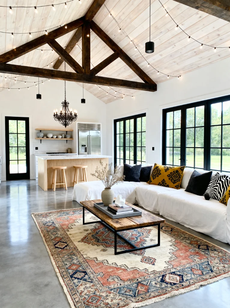 The contrast here is what makes it work. You have those heavy, dark-stained beams anchoring the room, but the ceiling itself is a light, white-washed wood that keeps things from feeling cave-like. And look at those floors—polished concrete! It’s a bold, industrial choice, but the massive, warm-toned Persian-style rug completely softens the look. It’s the perfect example of how to mix “hard” materials like concrete with “soft” elements like a plush white sectional.