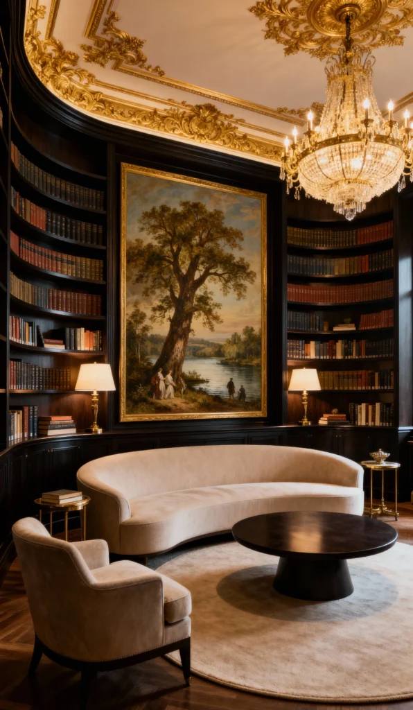 This is the ultimate cozy-meets-chic library. The deep, dark wood of the curved bookcases against the crisp white sofa feels so sophisticated, doesn’t it? And can we talk about that massive landscape painting? It draws the eye right in and creates a serene focal point. Add in that opulent chandelier and those soft lamps, and you’ve got a space that’s perfect for curling up with a classic novel. It’s dark, dramatic, and utterly divine.