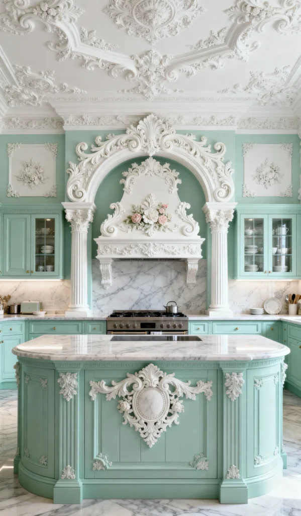 Have you ever seen a kitchen this dreamy? The mint green cabinets and marble counters are stunning, but the ornate, baroque white plasterwork is what takes this space to another level. The arched range hood with the floral detail looks like a piece of art. It’s unexpected, incredibly feminine, and ultra-luxurious. This proves that utility can be truly spectacular when done with such incredible attention to detail.