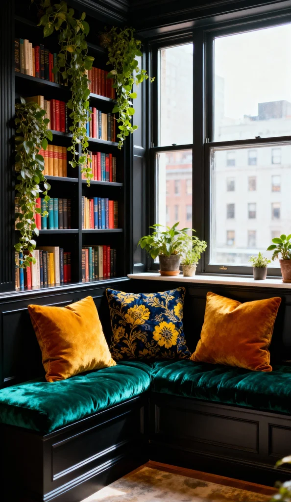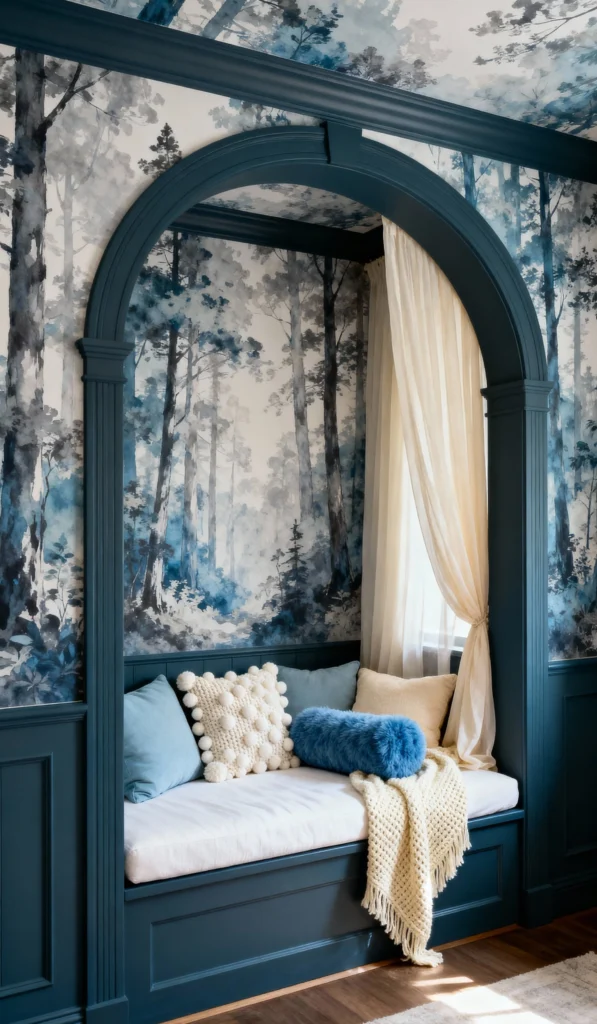 I am obsessed with this reading nook! The dramatic, deep blue archway beautifully frames the daybed, and the watercolor forest mural wallpaper creates an immersive, magical atmosphere. It feels like a little cabin getaway right inside your home. The mix of cozy cushions and the flowing sheer curtain softens the look. It’s a brilliant way to add a playful and peaceful element to a bedroom or study.