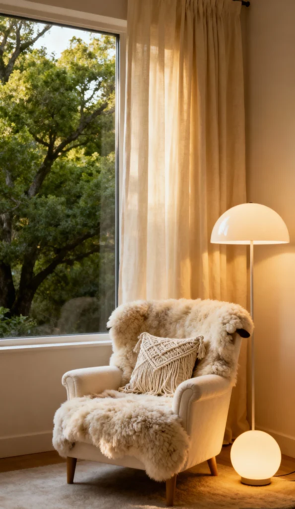 Now, this is what I call a hygge heaven! That sheepskin-covered armchair looks like the comfiest place on earth—you’d sink right into it. The neutral palette of creams and tans, paired with the sheer linen curtains, creates a soft, calming atmosphere. The modern, mushroom-shaped lamp and the macrame pillow add just the right touch of texture and contemporary style. Plus, that big window looking out at the trees? Pure relaxation.
