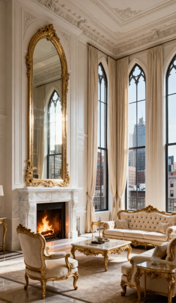 This living room screams classic Hollywood glamour! The high ceilings, the floor-to-ceiling gothic-style windows, and the immaculate white and gold color scheme are just stunning. That oversized, antique gold mirror above the roaring fire is the perfect focal point, reflecting all that beautiful light. The tufted, gilded furniture looks incredibly regal. It’s a sophisticated space that masterfully blends historical elegance with a modern city view.