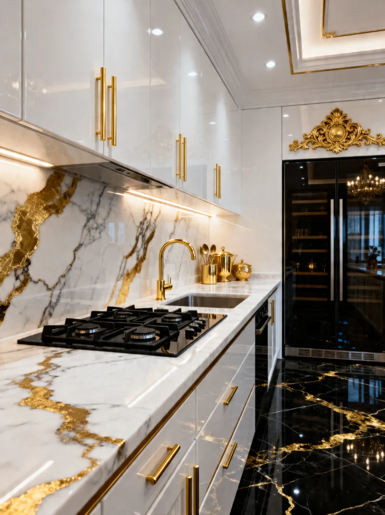 Let’s talk about drama. Usually, when people think of “luxury,” they go straight to bright white. But this kitchen? It’s leaning into the dark side in the best way possible. The first thing that hits you is that incredible black marble flooring with lightning-bolts of gold veining. It feels less like a floor and more like a piece of abstract art you happen to walk on.
