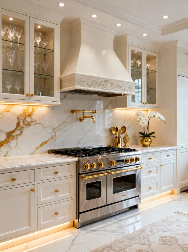 This design feels a bit more traditional but turns the luxury dial up to eleven. It’s all about the details here. Look at the custom range hood—it’s got intricate molding and a massive gold medallion right in the center. It’s basically a crown for your stove.