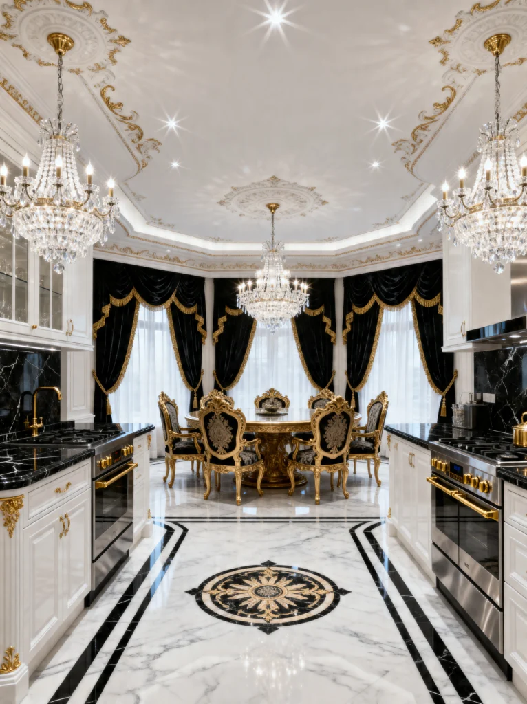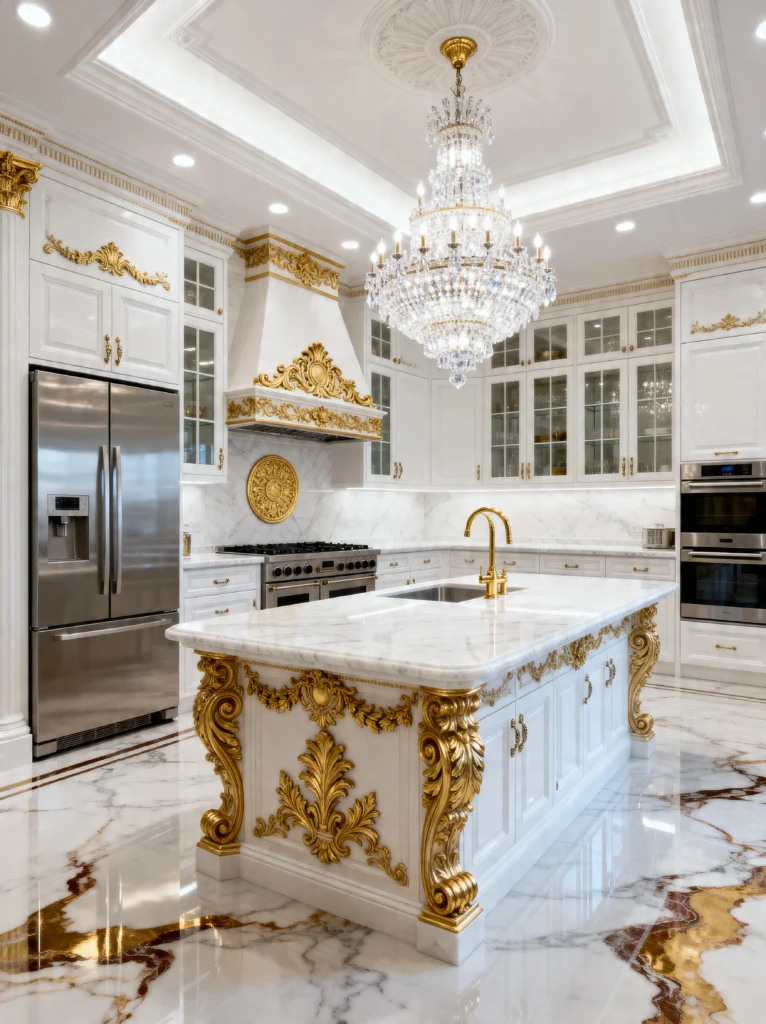 The contrast between the bright white cabinets and the heavy gold accents is so bold. And that chandelier? It’s massive! It perfectly anchors the room and makes the ceiling feel a mile high. Even the floor is part of the design, with that marble featuring deep, amber-colored “cracks” that mirror the gold throughout the room. It’s definitely a maximalist’s dream. It’s the kind of space where every detail has been considered, from the crown molding to the custom refrigerator panels. It’s grand, it’s theatrical, and it’s unapologetically luxurious.