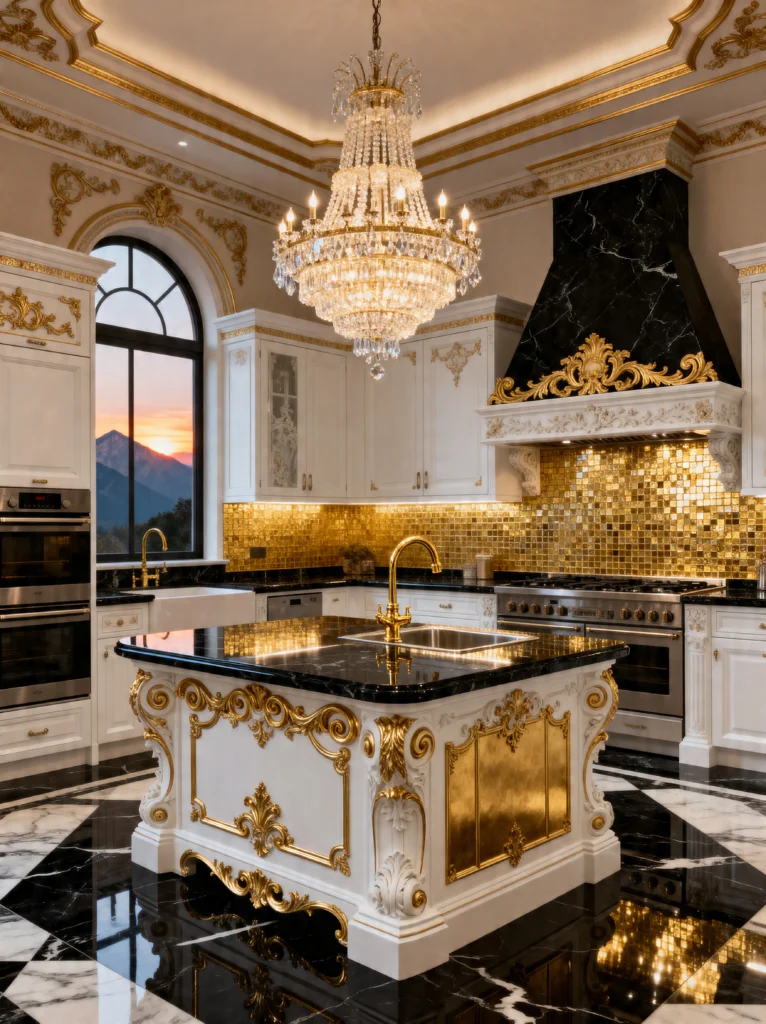 Okay, now we are stepping into some serious “palace” territory! If you’ve ever wanted to feel like royalty while making your morning toast, this is the blueprint. This kitchen is absolutely dripping in gold leaf and intricate carvings. Every single surface, from the legs of the island to the trim on the vent hood, is adorned with these incredibly detailed Baroque flourishes.