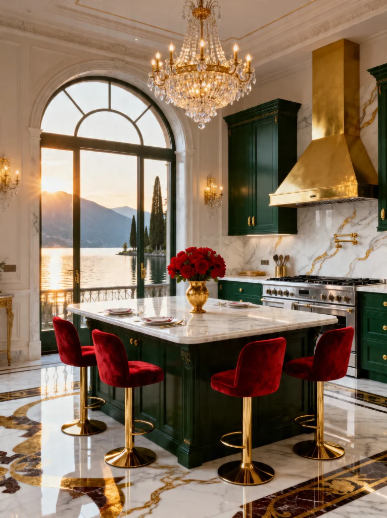 The view outside that arched window is obviously a dream, but the interior holds its own. Look at the gold range hood—it’s massive, brushed to perfection, and makes a serious statement against the marble backsplash. To tie it all together, they’ve added these plush, ruby-red velvet barstools. It’s a daring color combo (green, gold, and red can easily go “Christmas” if you aren’t careful), but here it just feels like a royal palace. The crystal chandelier hanging over the island is the literal cherry on top, scattering light everywhere when the sun hits that lake view. It’s warm, it’s inviting, and it’s undeniably expensive.